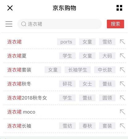 京东代运营举例:我们在搜索连衣裙的时候,下拉框会出现很多连衣裙相关的词,例如现在很多商家已经在做夏季的上新了(虽然还有很多地方还是羽绒服),我们选择的时候就可以采用连衣裙夏 学生这个属性了。