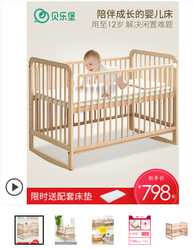2、分析买家的需求  最重要的卖点以显眼的方式展示在主图上,你的买家是追求特价,还是追求品质,是要静音的,还是要功能多的,弄清楚这个,你的主图文案就不会出大错了。  我举两个例子:  第一个比如实木婴儿床,如果你的主图文案上有一句“陪宝宝一起长大的婴儿床”是不是很打动宝妈们的心呢?