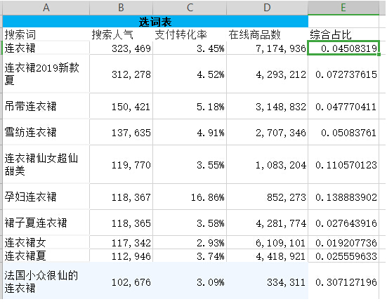 我们把找来的词都放在一个表格里。这里的词呢,是我们产品的延伸词、有搜索人气,唯一不好的就是有的竞争太大,我们找竞争小的词,所以我这里添加了一列综合占比,用搜索人气/在线商品数,这里除出来会是一串小数。