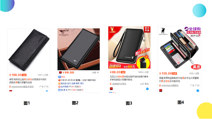 第一步就是定款。确定一个有利润空间的好款,然后去测图,记住一句话:无好款,不测图!然后找出两张以上风格迥异的图,比如我搜索“钱包男”,找了四张图,一起来看下案例: